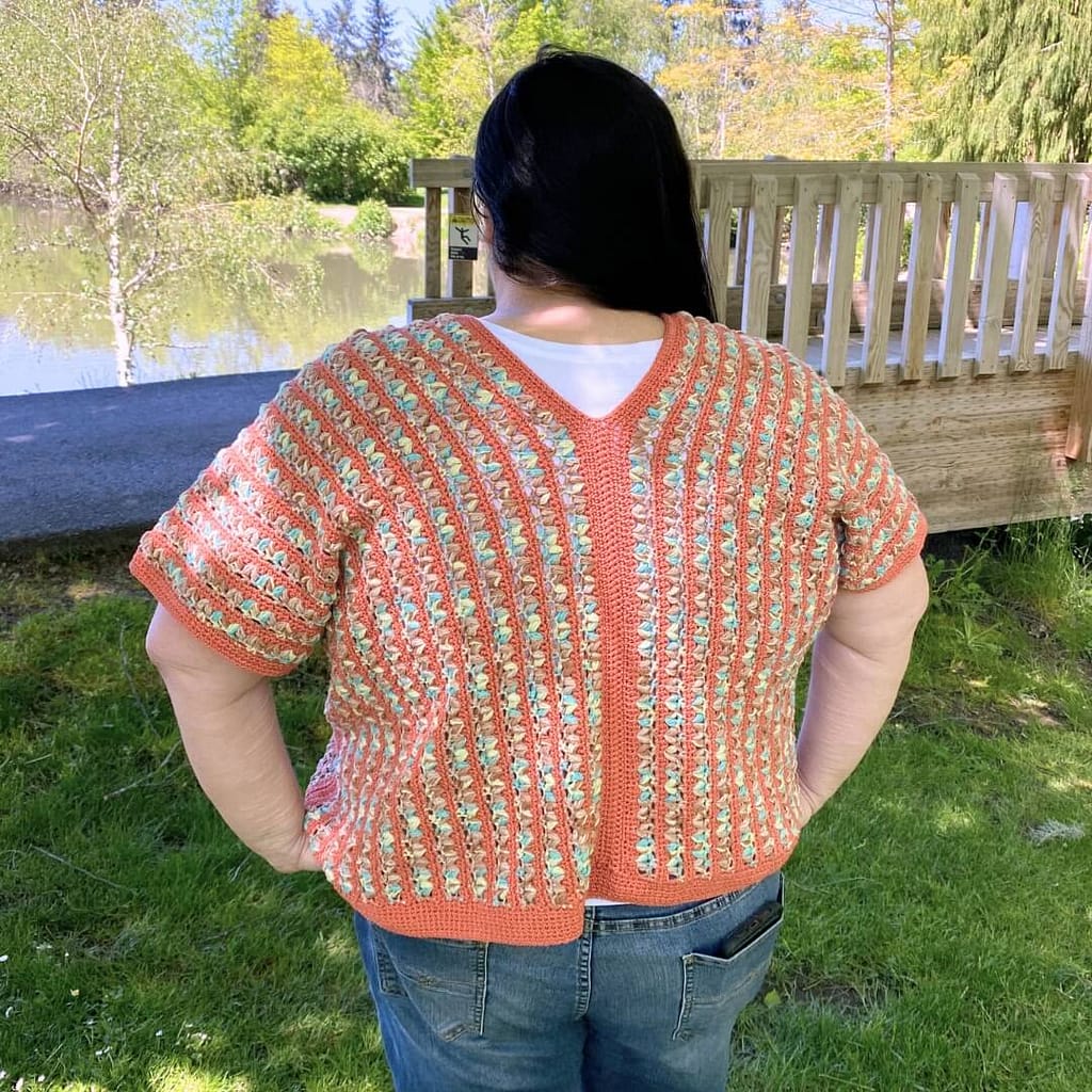 This garment can be easily adapted “as-you-go”, modifying the bust size by adapting the number of rows of the body parts and the length doing the same in the hem.
