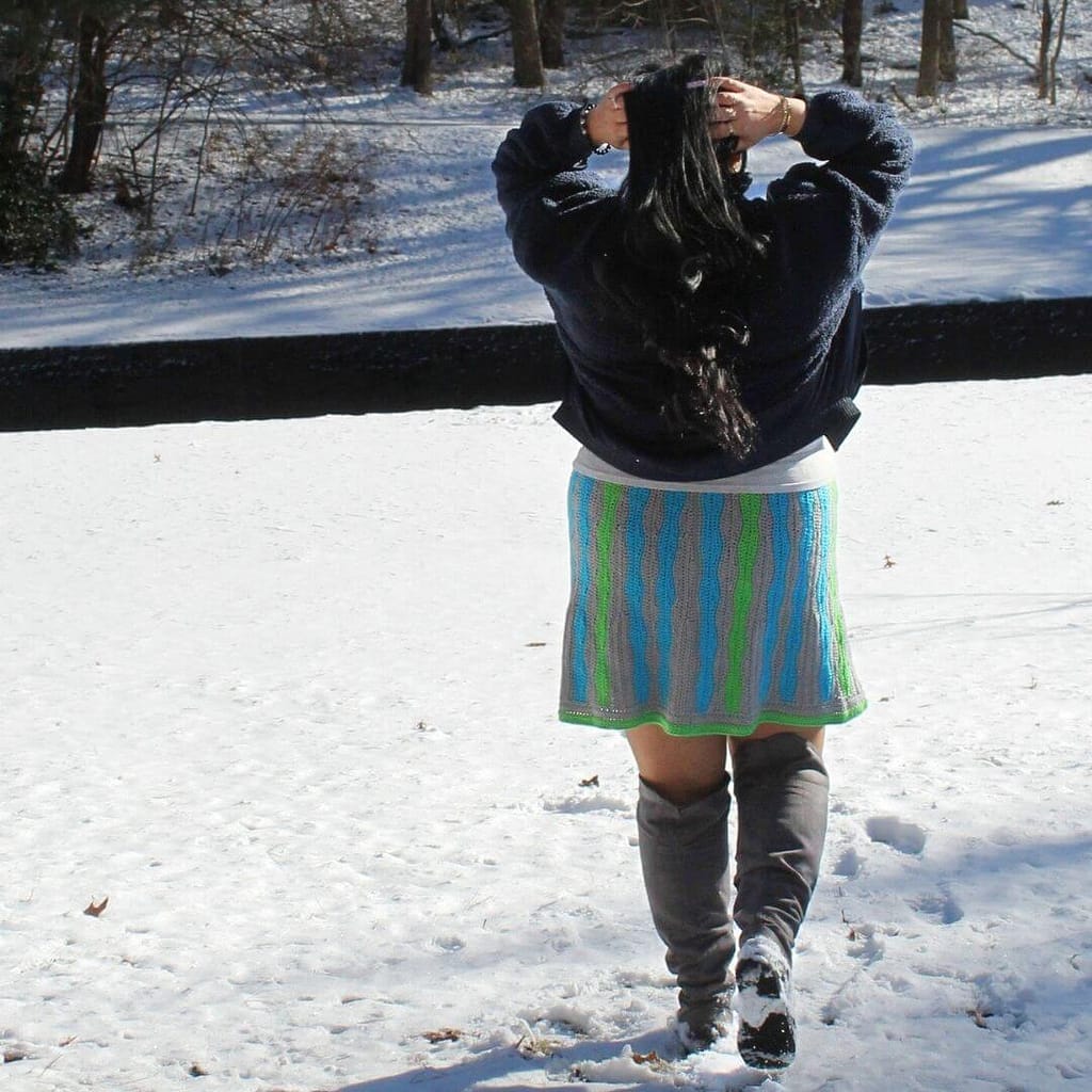 The Rolling Waves Skirt works sideways, and the idea to work that way originated out of the Wave stitch pattern itself and alternating stripes of different colors. In my opinion, if the skirt has stripes along the body and not across, it is visually more flattering for any body type.
