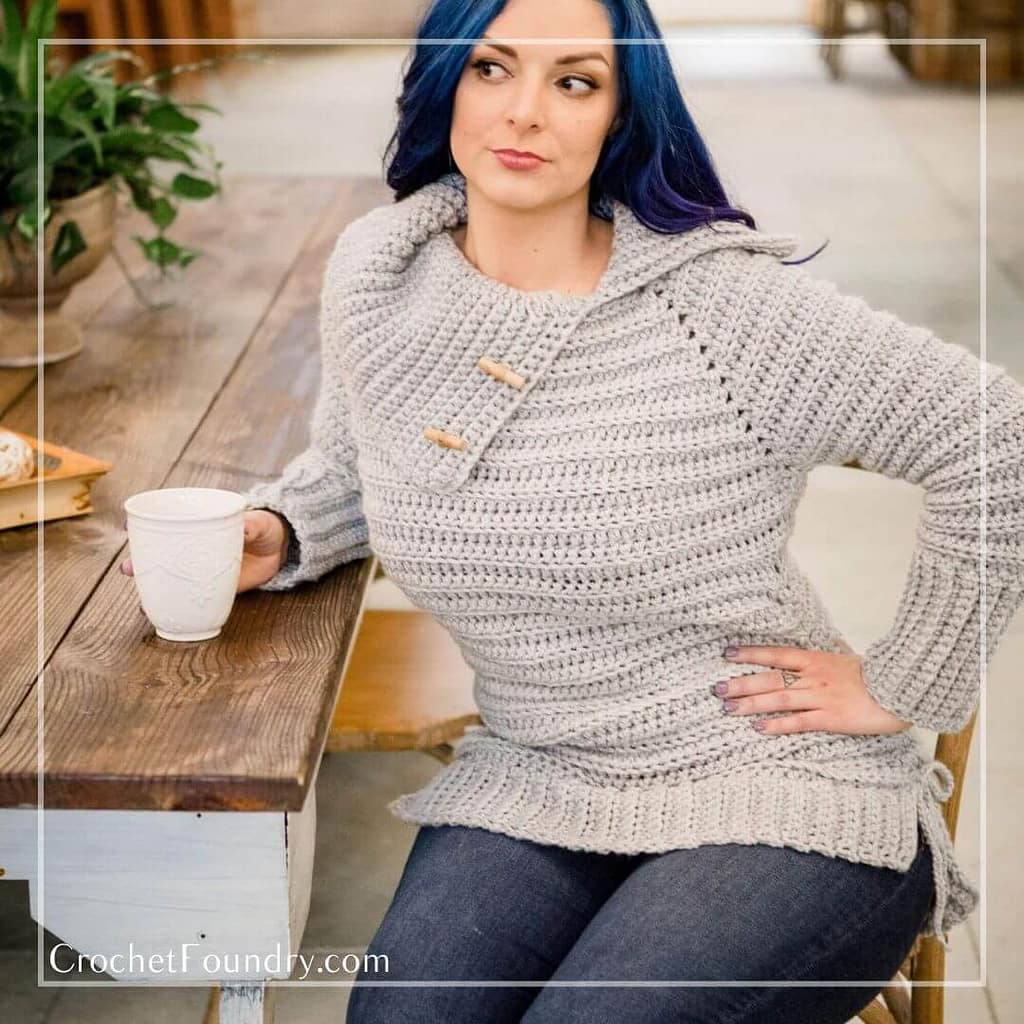 Lazily sip your favorite warm beverage this Fall with this warm and stylish Cafe Au Lait Cozy Cowl Neck Sweater originally published in our Fall 2020 issue. Its fashionable split cowl neck with toggle buttons provides a trendy look that’s perfect for the chilly weather. The Cafe Au Lait Cozy Cowl Neck Sweater embraces a chic and modern look with the ability to cinch up its sides while using simple shaping to flatter your unique body type. This design will work up easily with its top down construction made using the simple yet elegant HDC stitch.