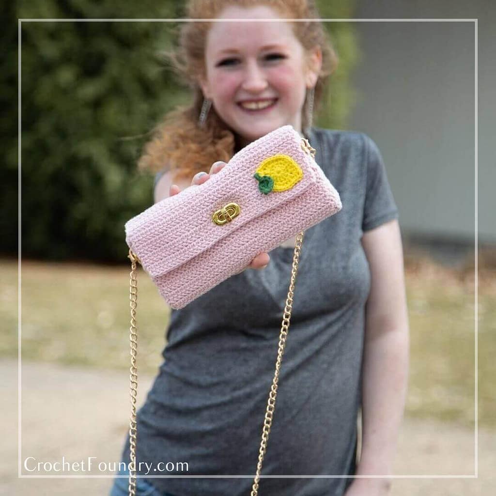 This fun clutch design features a cute lemon applique and is perfect for the summer months. Using gold purse hardware and chain strap gives your handmade clutch a professional finish. This project is made of 3 crochet panels that are seamed together and a plastic canvas box is created and sewn into the clutch to give it some structure.