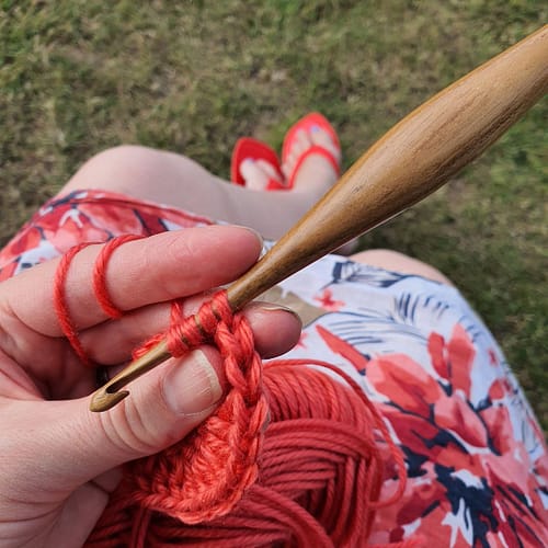 Used for samples: US D/3 (3.25 mm) Furls Gold Streamline Metal Crochet Hook