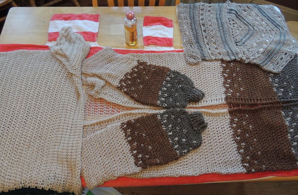Most crochet (or knit) items will need to be re-shaped when you lay them out to dry. You see that cardigan? It really wanted to be tall and skinny. Those sleeves wanted to be as long as the rest of it! I had to gently shape it in a more short and wide form so it would still fit when it was done drying. Different fibers will react differently to being so wet, but most of them will need to be carefully shaped when you lay them out to dry.