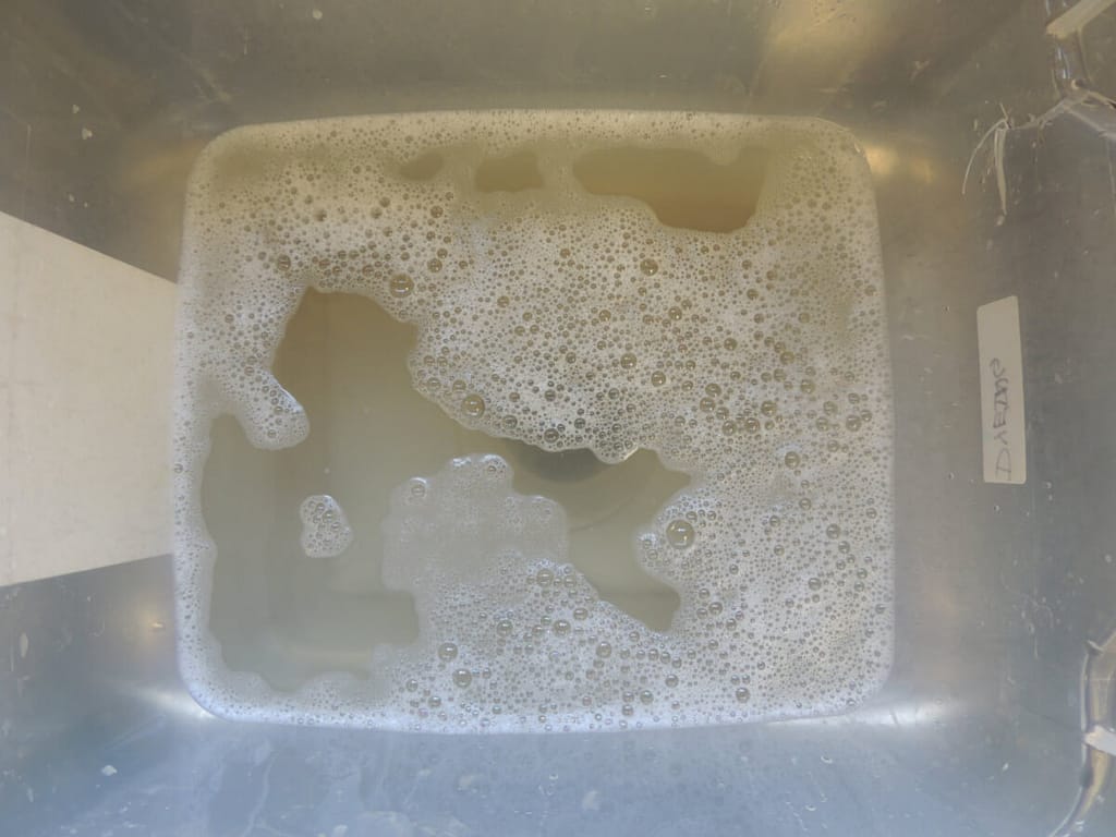 Look at the water left in the washing bin. That all came out without scrubbing or agitating. Just a few squeezes and some gentle mixing about. Trust the product; it will do what it’s meant to do without you having to abuse your delicates!
