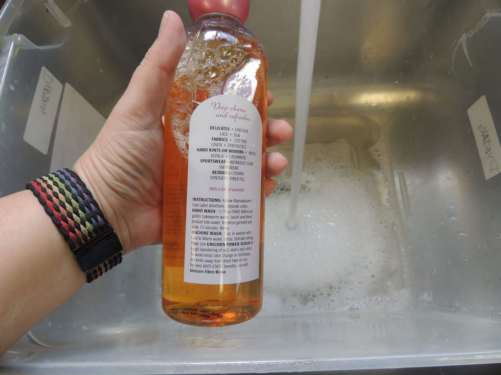 First I gave my sink a good cleaning, then put a bin in the sink. I poured in about a Tablespoon of Fibre Wash and filled it with about 2 gallons of lukewarm water. All the instructions on how to use each Unicorn product are on the back labels of the products, so you don’t have to look it up each time. I’ve never had a label start to peel off, so the instructions are always there.