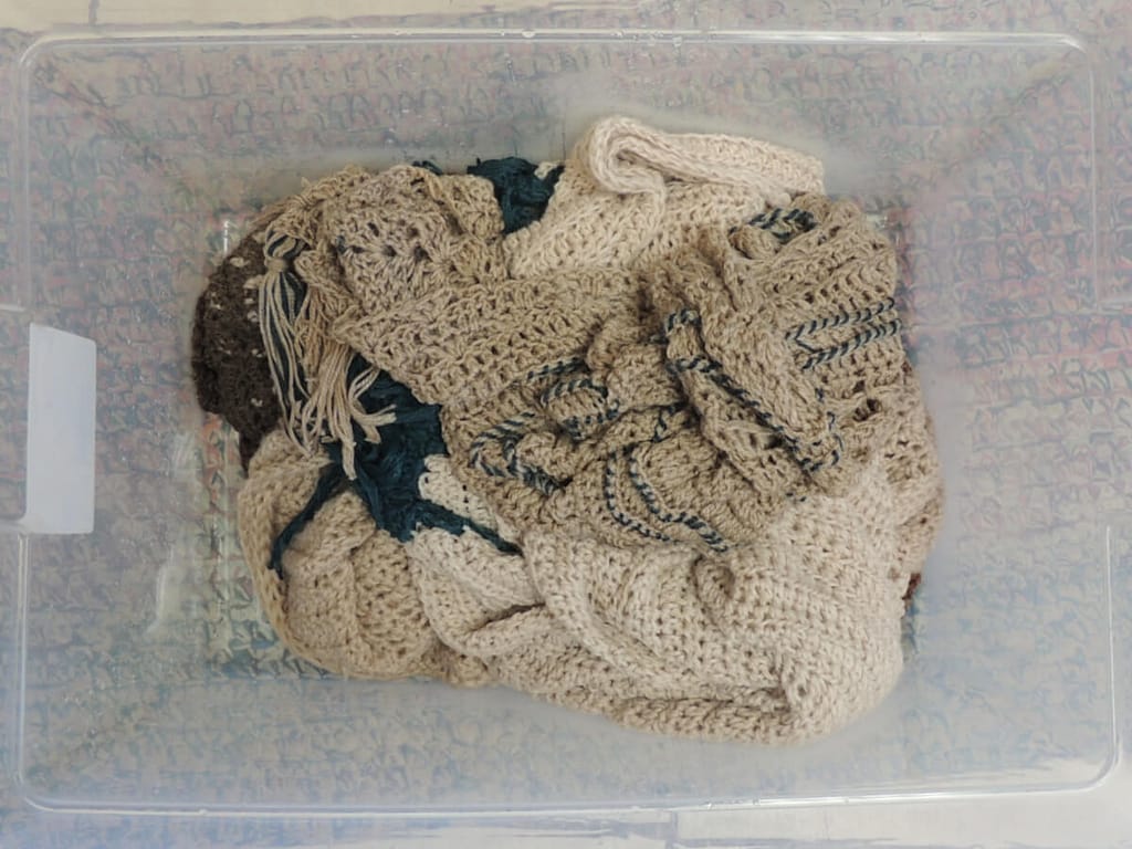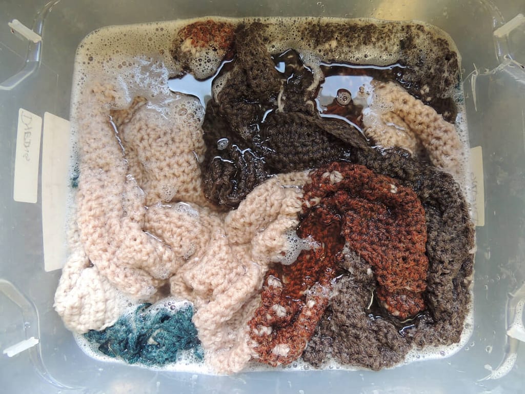 Once I had all the water and Fibre Wash in the bin, I added in the three crochet pieces. I like to give them some gentle squeezes, and mix them just a bit. Be gentle when you are cleaning feltable items, you don’t want to ruin something you worked so hard to make!