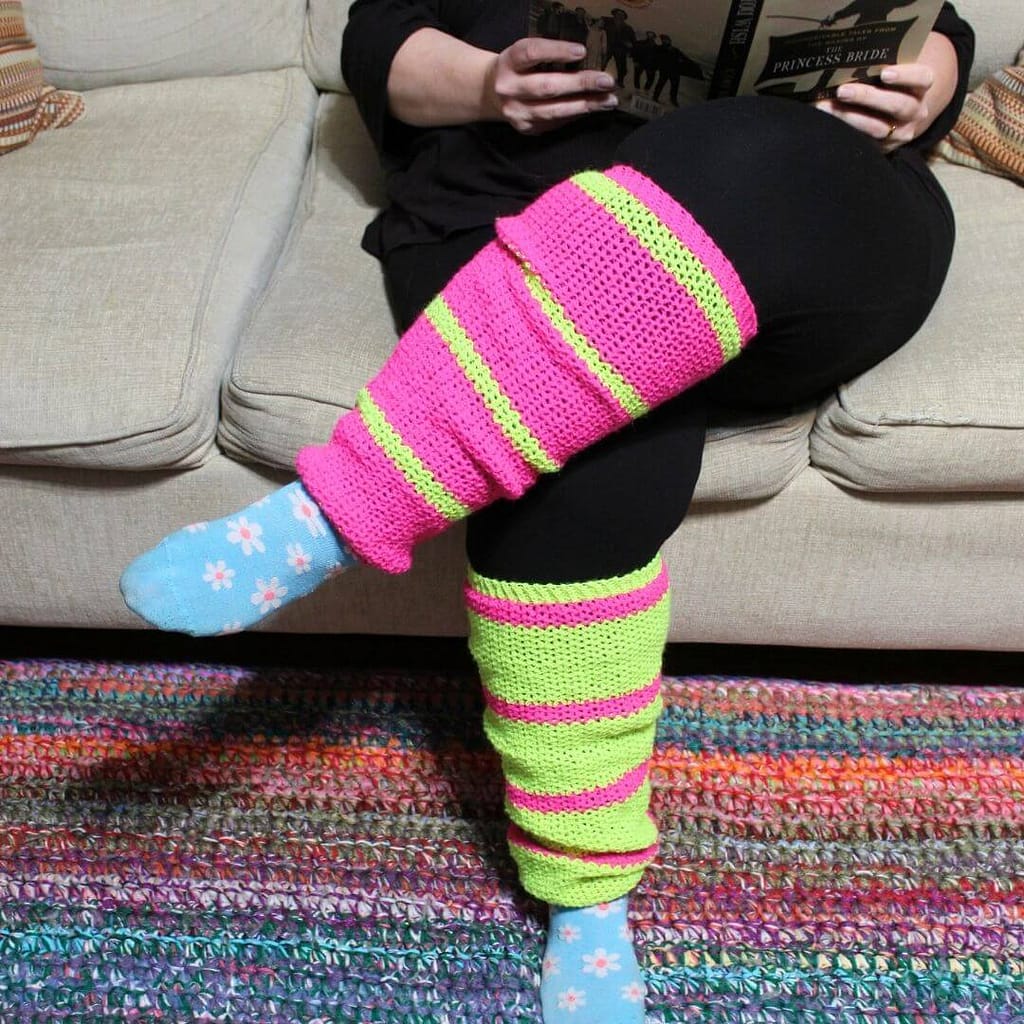 We’ve Got The Beat Legwarmers: I first noticed Neon coming back into style about 2 years ago, and the 80’s came right back to me. Then when Hobbii shared their Silly Socks Disco yarn with me, I KNEW I had to make a super rad set of leg warmers. I remembered how my friend Emily and I used to trade off one Chuck so we each had one red Chuck and one black Chuck, then we would wear the opposite color sock bunched up on top of the Chucks. That memory made me want to make the colors opposite on each legwarmer.