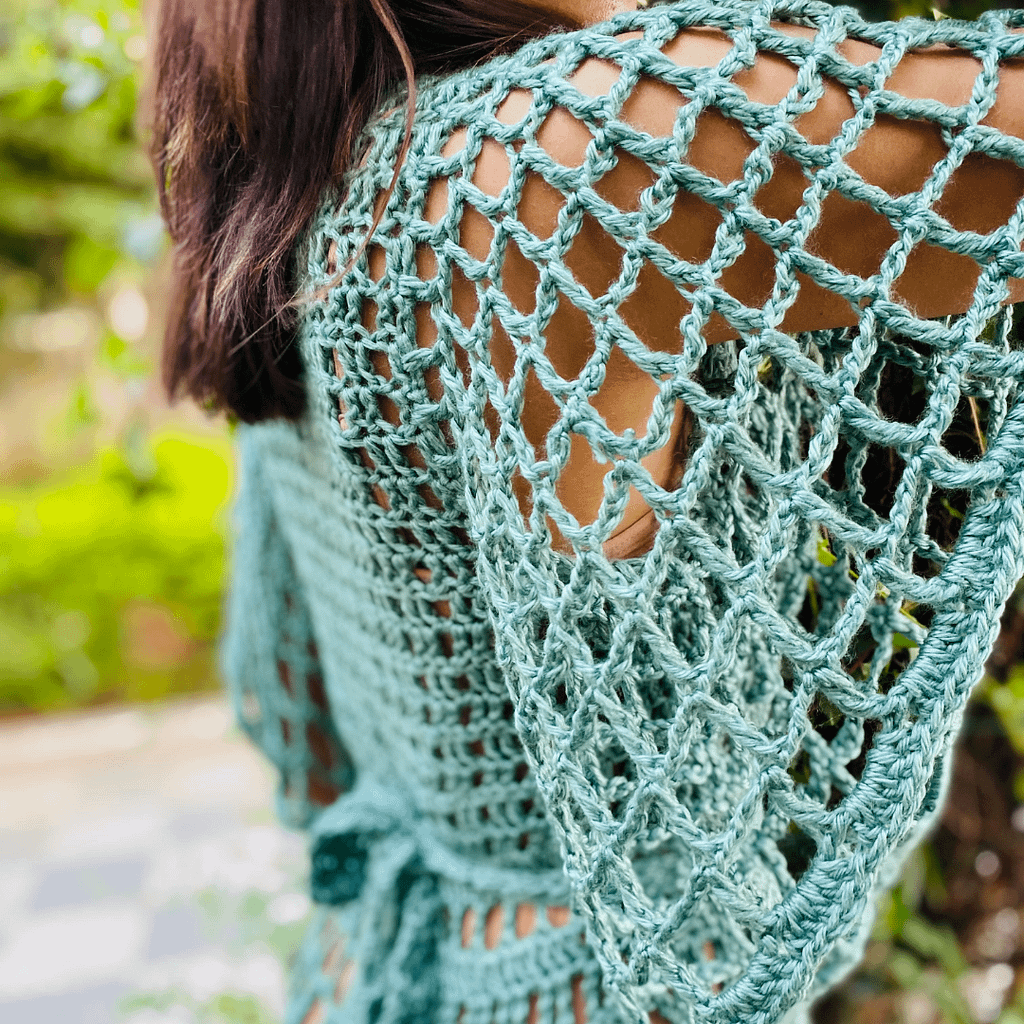 Summer dresses are my favorite to design. I wanted to work up a quick garment with double and triple crochet creating a mesh-like fabric. A breezy summer dress which would work great as a crop top, a dress and a cover-up. Thus Meshy dress was born.