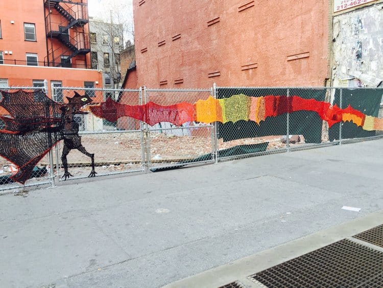 One of my favorites pieces is a large crochet dragon I hung on 6th Ave. and 14th St. in NYC. It stayed up for two weeks, which is a great run for a yarn bomb in such a busy area! When it eventually came down, people in the neighborhood hung ribbons on the fence with messages like “Who took my Dragon?” and “Where is my Dragon?” It was so touching to see how much the art meant to the community. It brought tears of joy to my eyes.
