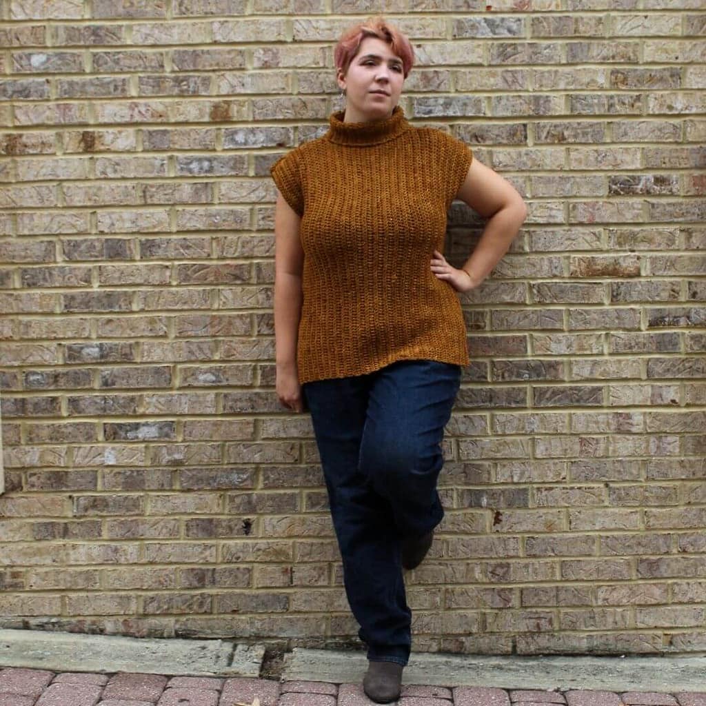 This design was inspired by all things cozy! I wanted to create a design that embodied the Fall aesthetic; cute coffee shops, libraries, falling leaves. I love Fall because it reminds us to slow down, something very closely connected with craft which for me is a daily reminder to take a break. I wanted to make a relaxing, rhythmic piece that is calming and Autumnal. I’ve also been inspired lately by all of the comfy vests popping up on my feed. There are so many fun ways to style a vest and it’s perfect for layering in the in between seasons! I also love drape, and the combination of the larger hook, merino yarn and looser stitch pattern really gives it a lovely flow that can be hard to achieve with crochet.
